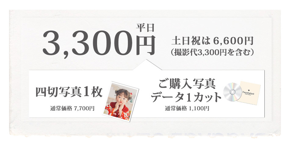 撮影代 平日 0円 土日祝 3,300円 ※パック商品ご購入の場合は、0円