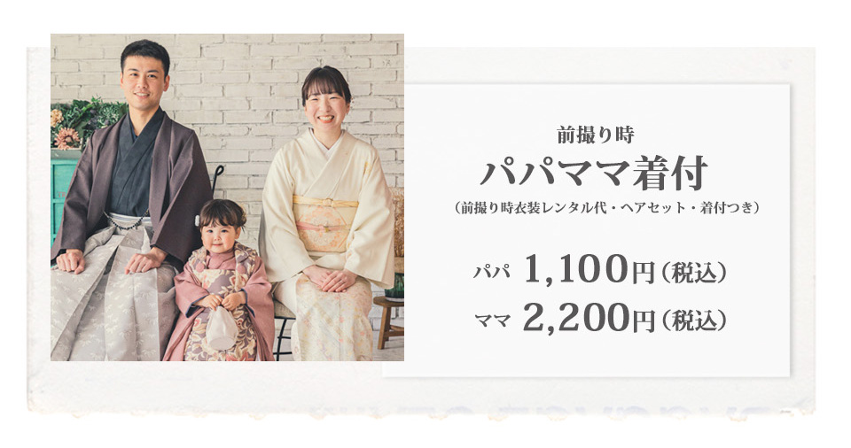 パパは衣装代・着付代、ママは衣装代・着付代・ヘアセットが料金に含まれます。