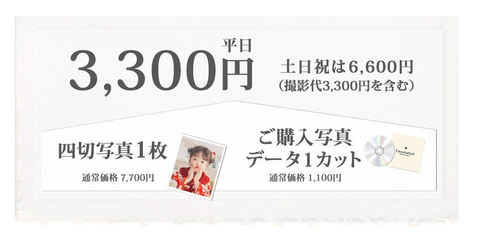 基本料金は、撮影代+衣装代2着+四切写真1枚+ご購入写真データ1カットがセットになります。