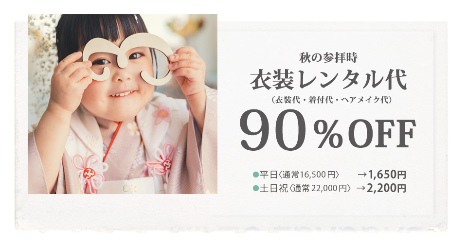追加で【秋の参拝時衣装レンタル】をご利用いただくと、衣装レンタル代90%OFFになります。